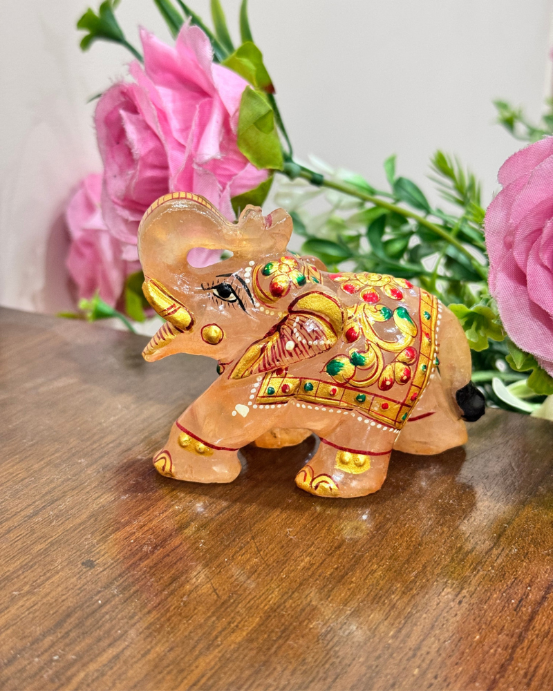 Add a touch of elegance and tradition to your home with this beautifully crafted peach elephant figurine. Made from a translucent peach-colored material, this decorative piece is intricately hand-painted with gold, red, green, and white accents, showcasing exquisite craftsmanship. The figurine features detailed patterns on its body, trunk, and legs, with a raised trunk symbolizing good luck and prosperity in many cultures.