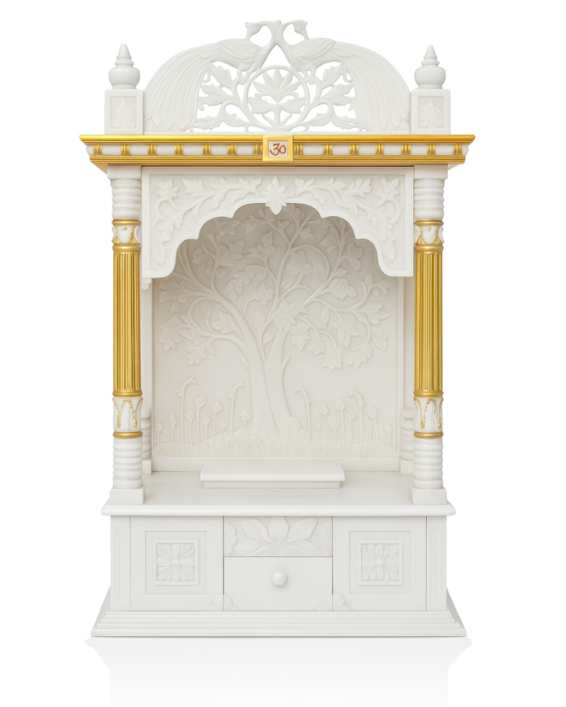 White & Gold Intricately Carved Hindu Mandir for Home - Elegant Temple Decor Enhance your spiritual space with this beautifully crafted white and gold Hindu mandir, designed for home worship and daily prayers. This intricately carved temple features a multi-tiered structure with a serene tree of life motif in the main chamber, golden accents, and a prominent red "Om" symbol on a golden plaque. The top is adorned with elegant peacock carvings, symbolizing beauty and spirituality, making it a perfect blend of traditional craftsmanship and modern elegance. The mandir is made from high-quality materials, ensuring durability and a premium finish. Its compact yet spacious design makes it ideal for placing idols, diyas, and other sacred items. Whether for your puja room or as a thoughtful gift, this mandir is a timeless addition to any home. Key Features: Material: High-quality engineered wood with a smooth white finish and golden accents. Design: Features intricate carvings, including a tree of life motif, peacock designs, and floral patterns. Dimensions: Approx. 24 inches (height) x 18 inches (width) x 12 inches (depth). Weight: Lightweight yet sturdy for easy placement. Usage: Ideal for home décor, puja rooms, or gifting during festivals and special occasions. Care Instructions: Wipe gently with a soft, dry cloth. Avoid exposure to water or harsh chemicals. Why Buy This Product? Combines traditional Hindu craftsmanship with modern aesthetics. Perfect for creating a serene and spiritual ambiance at home. Compact design suitable for small and large spaces. Makes a thoughtful gift for housewarmings, weddings, or festivals.